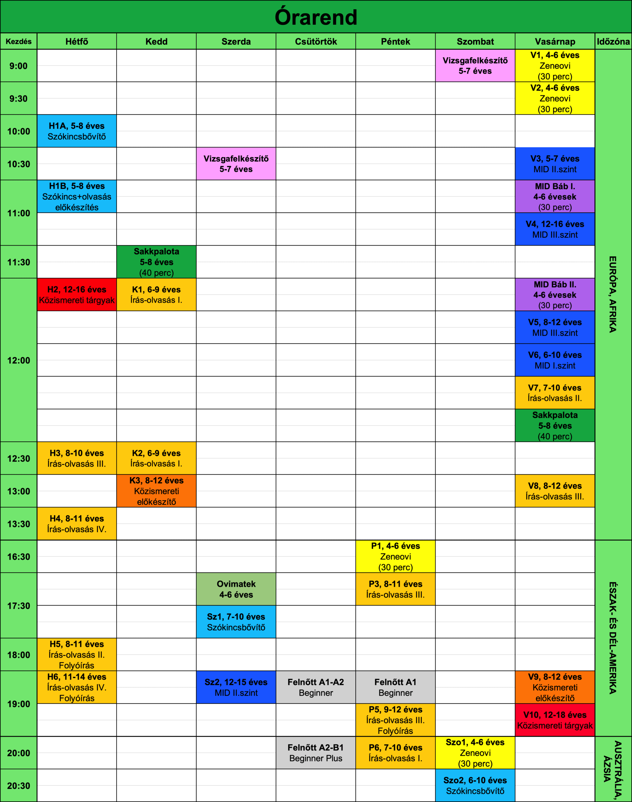 (kivéve az órarendben külön jelölt foglalkozások)